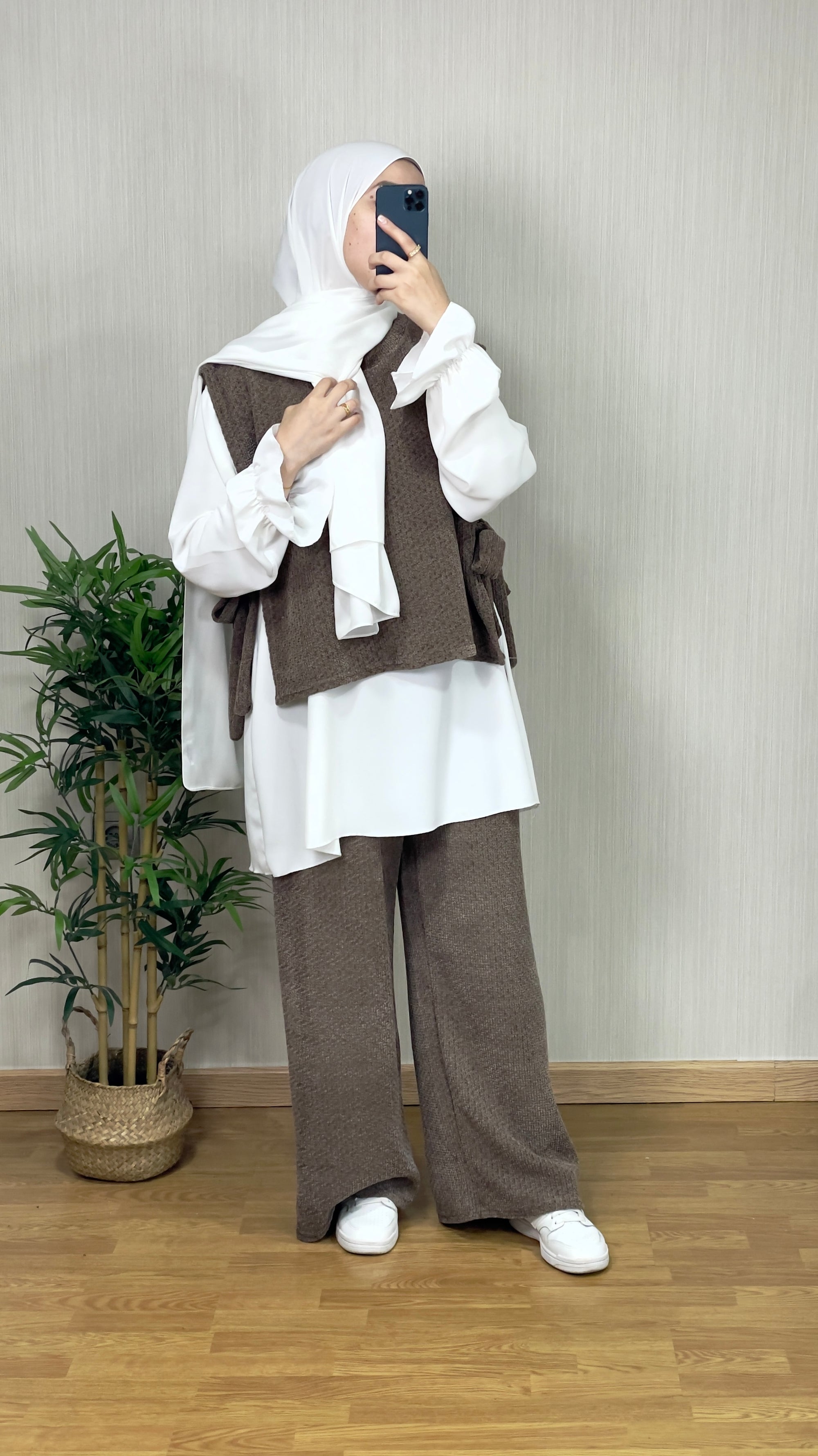 Chaleco de punto tierra texturizado, con aberturas laterales y lazo ajustable, que aporta un toque moderno y en tendencia.