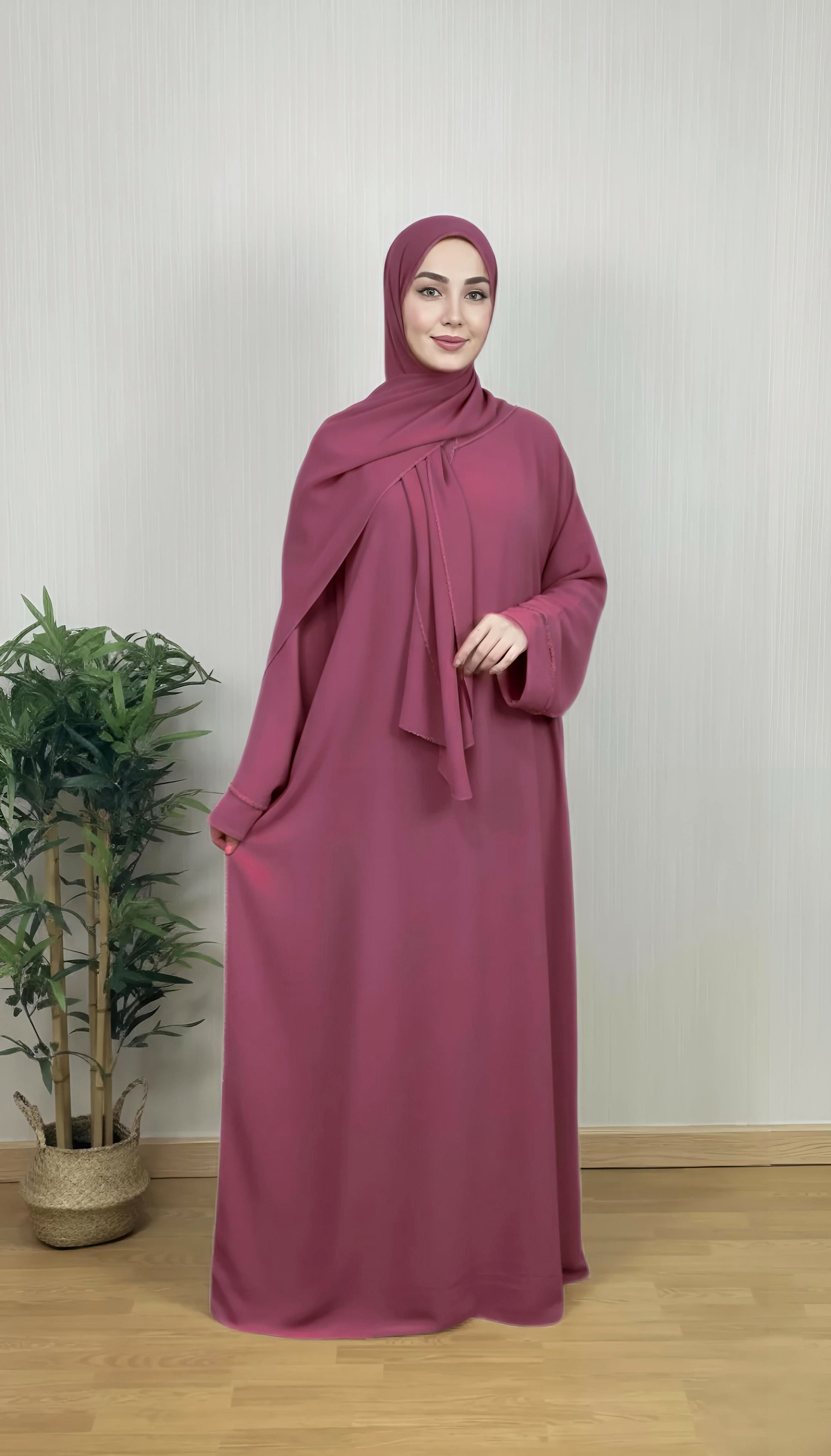 Nuestra Abaya Magenta incluye el Hijab que va incorporado en la prenda. Por lo que tendrás en una misma prenda la abaya con el Hijab.