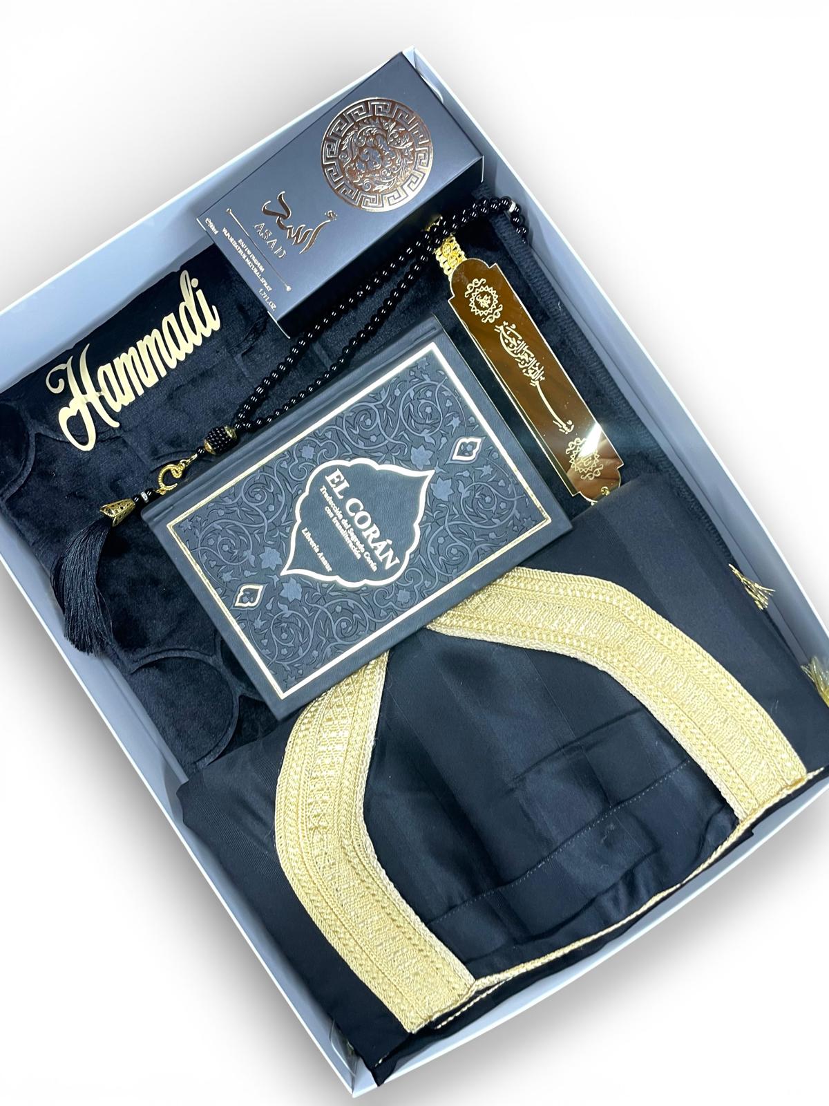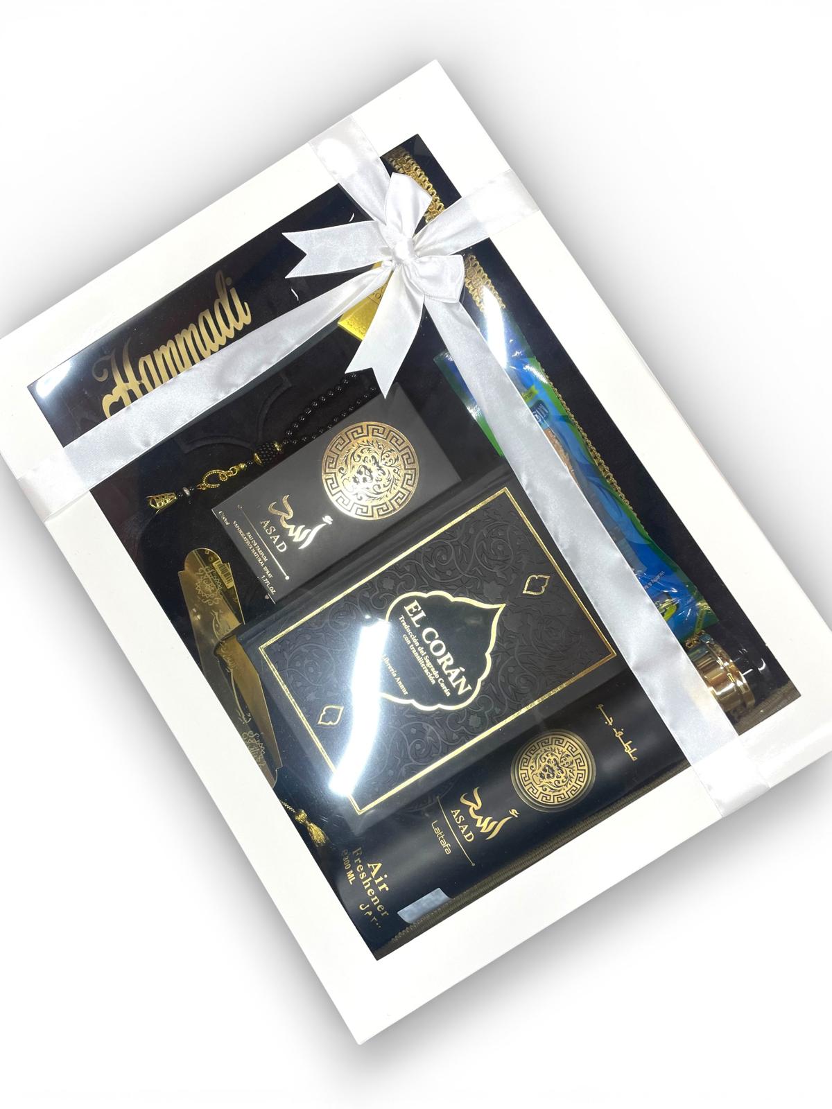 Incluye prendas tradicionales, accesorios esenciales para la oración y detalles aromáticos árabes, todo presentado en una caja de regalo premium lista para sorprender.