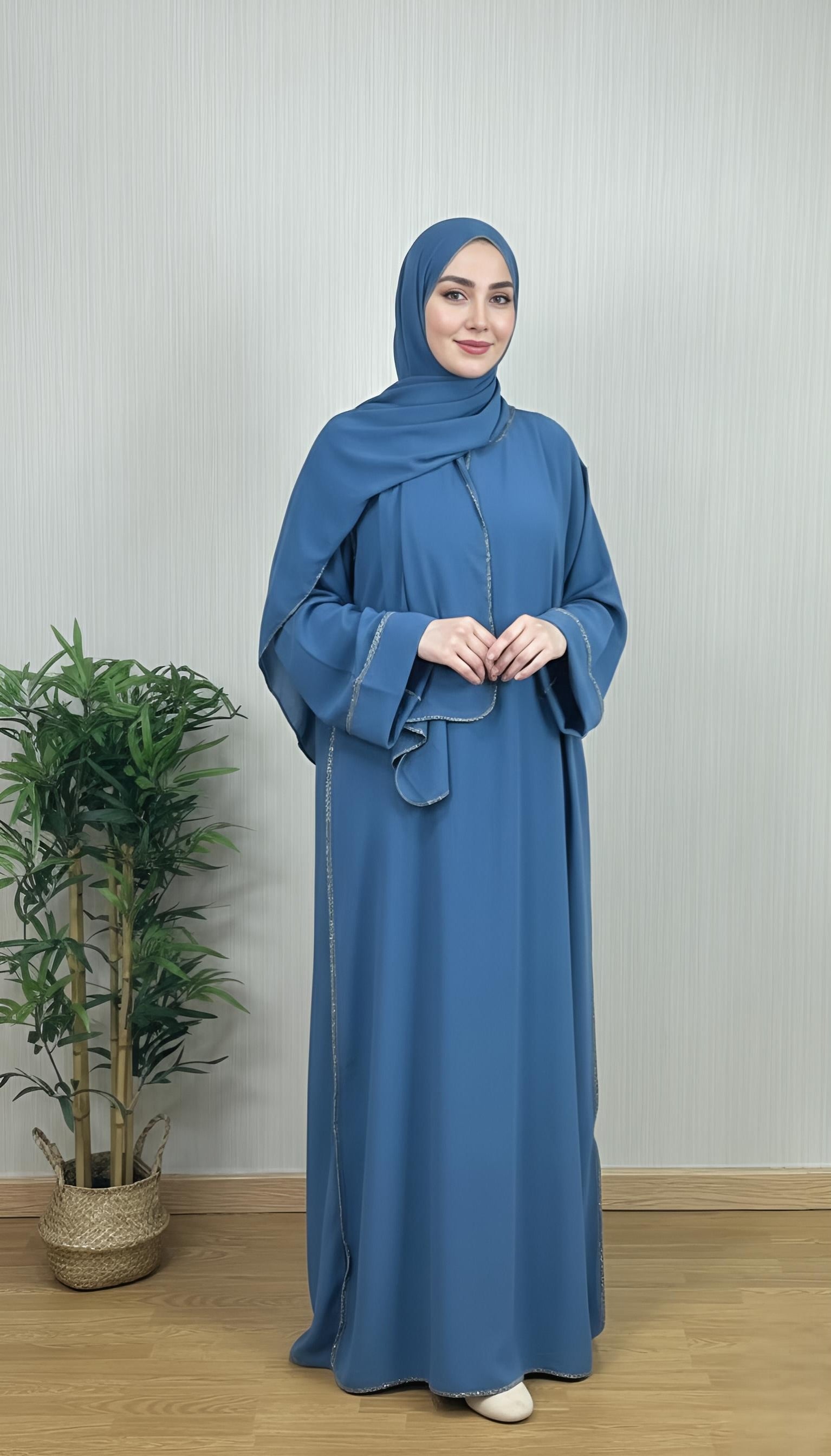 Nuestra Abaya Azul incluye el Hijab que va incorporado en la prenda. Por lo que tendrás en una misma prenda la abaya con el Hijab.
