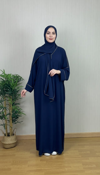 Nuestra Abaya Azul Marino incluye el Hijab que va incorporado en la prenda. Por lo que tendrás en una misma prenda la abaya con el Hijab.