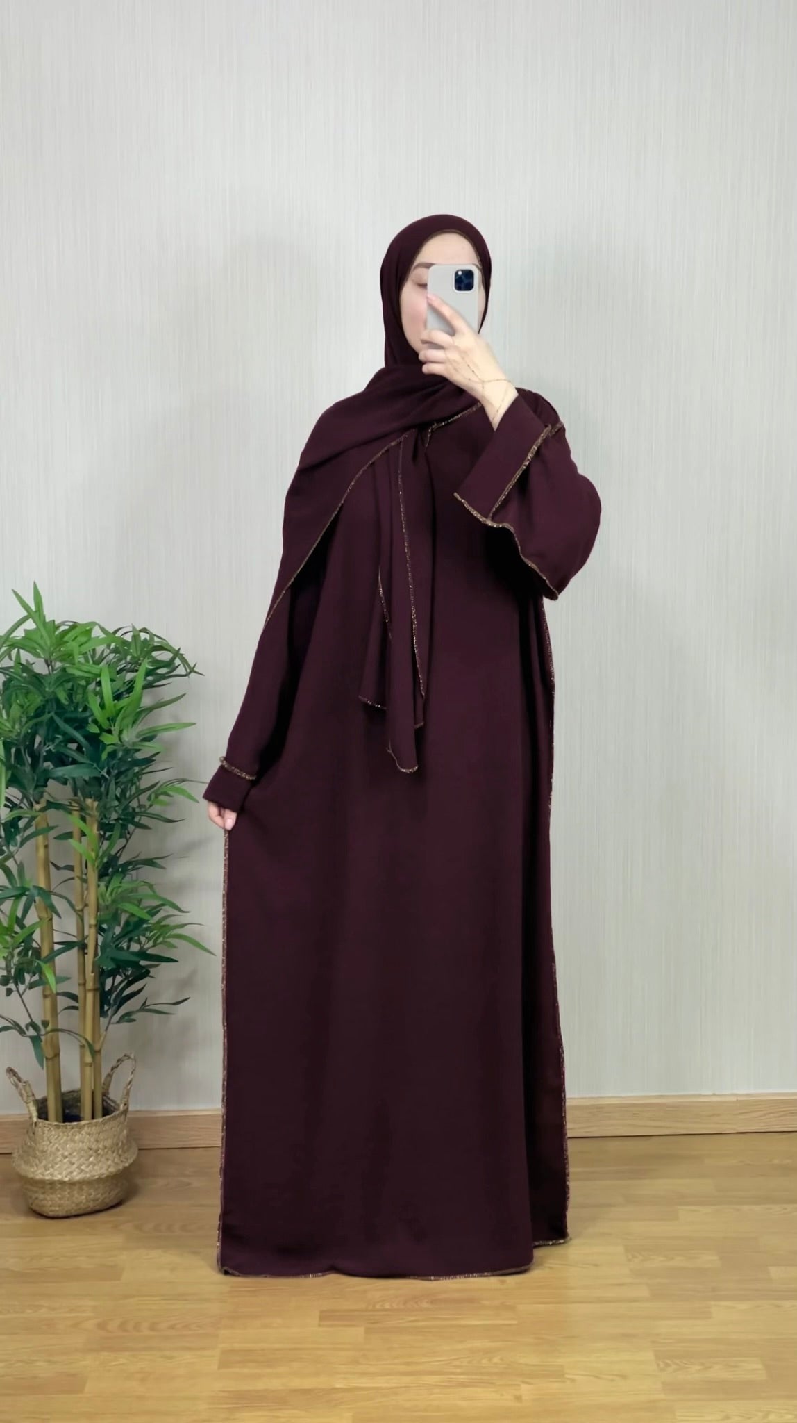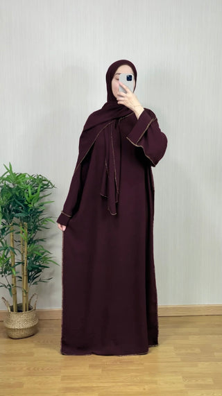 Nuestra Abaya Burgundy incluye el Hijab que va incorporado en la prenda. Por lo que tendrás en una misma prenda la abaya con el Hijab.