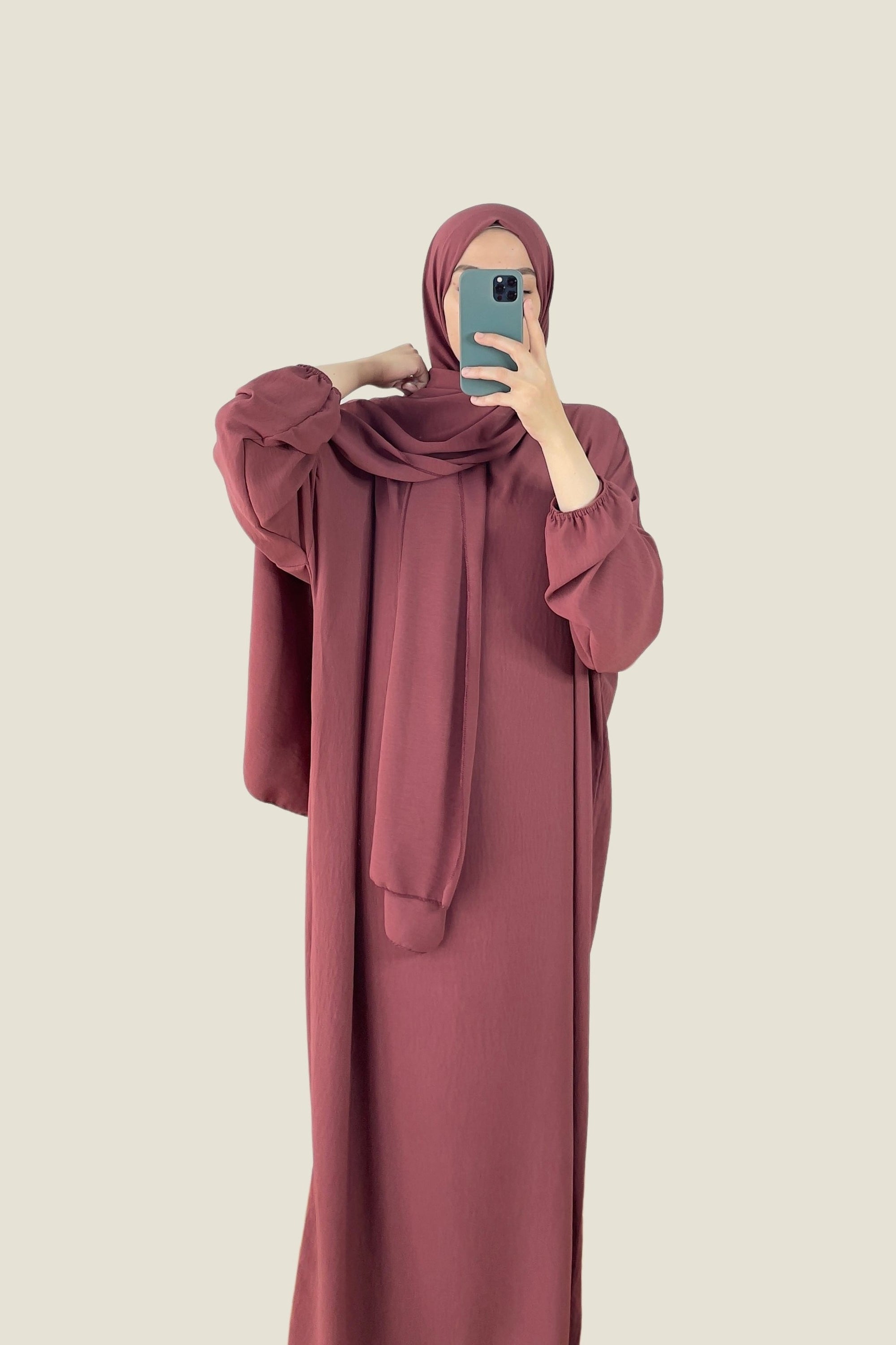 Nuestra Abaya Rosa incluye el Hijab que va incorporado en la prenda. Por lo que tendrás en una misma prenda la abaya con el Hijab.