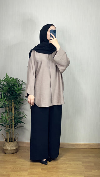Este pantalón amplio confeccionado en tela jazz combina comodidad y elegancia en un diseño modesto. Su caída fluida y corte relajado ofrecen un ajuste favorecedor y versátil, ideal para cualquier ocasión.